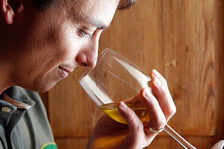 Om de aroma's te waarderen, moeten we het glas verwarmen en identificeren: fruitig groen of volwassen, kruid, appel, amandel, tomaat, banaan, vijg, hooi ……