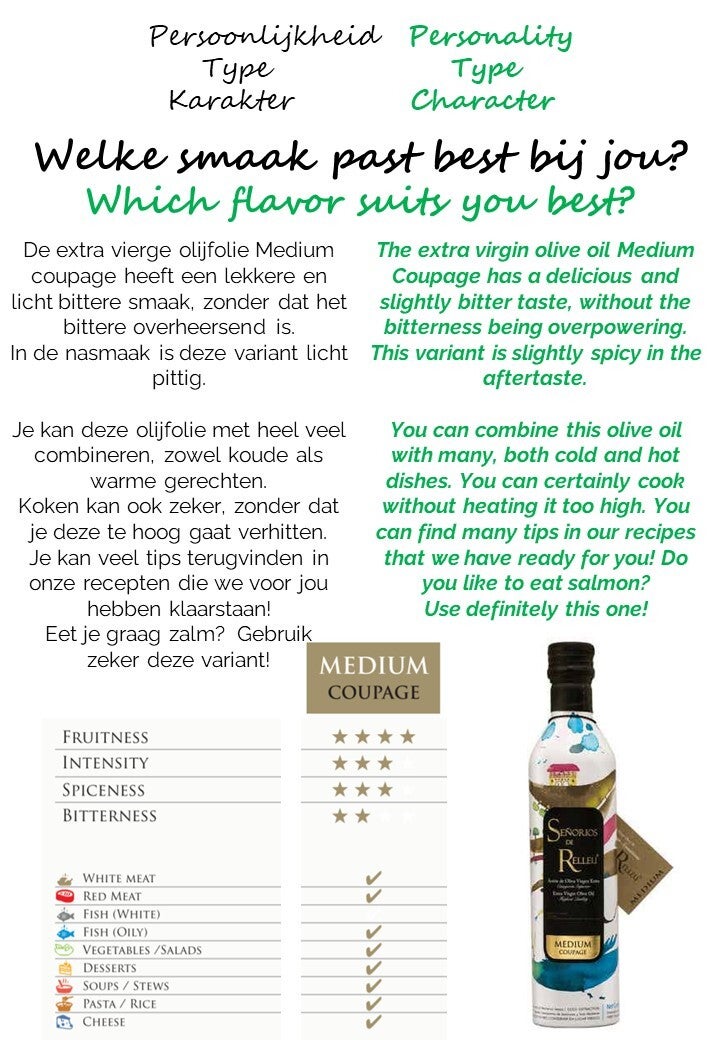 De Extra Vierge Olijfolie Medium Coupage 500 ml. Señoríos de Relleu®, is een combinatie van extra vierge olijfolie van vijf inheemse en arbequina-variëteiten, medium fruitig, licht bitter en een pittige smaak, sterke smaak.