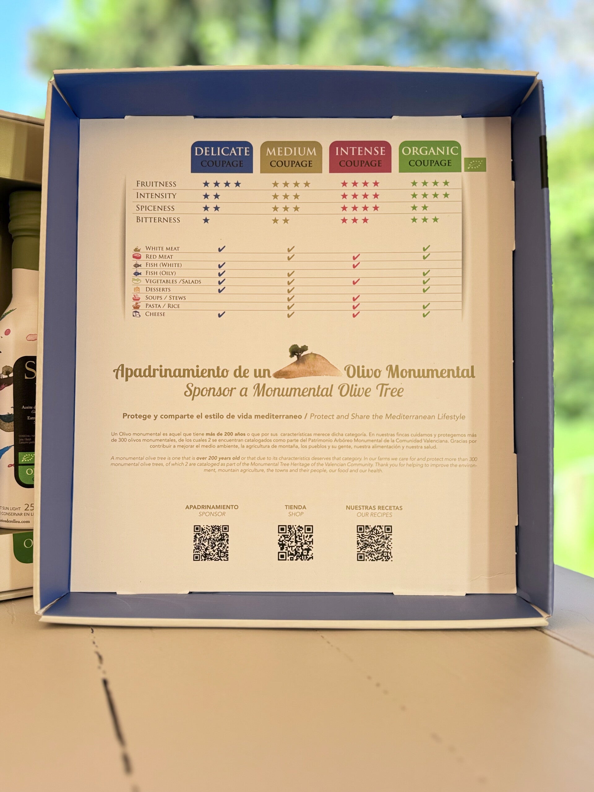 The Organic Coupage Extra Virgin Olive Oil 250 ml. Señoríos de Relleu®, is a blend of organic olive trees from five natives varieties of Alicante and arbequina, with a medium fruity, a slight bitterness and a medium-high spicy.