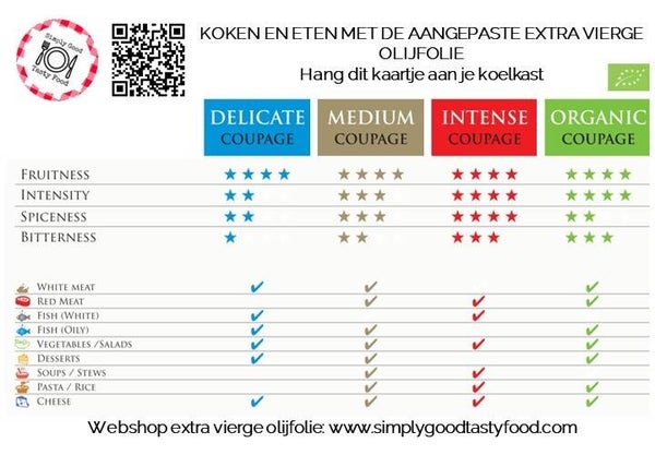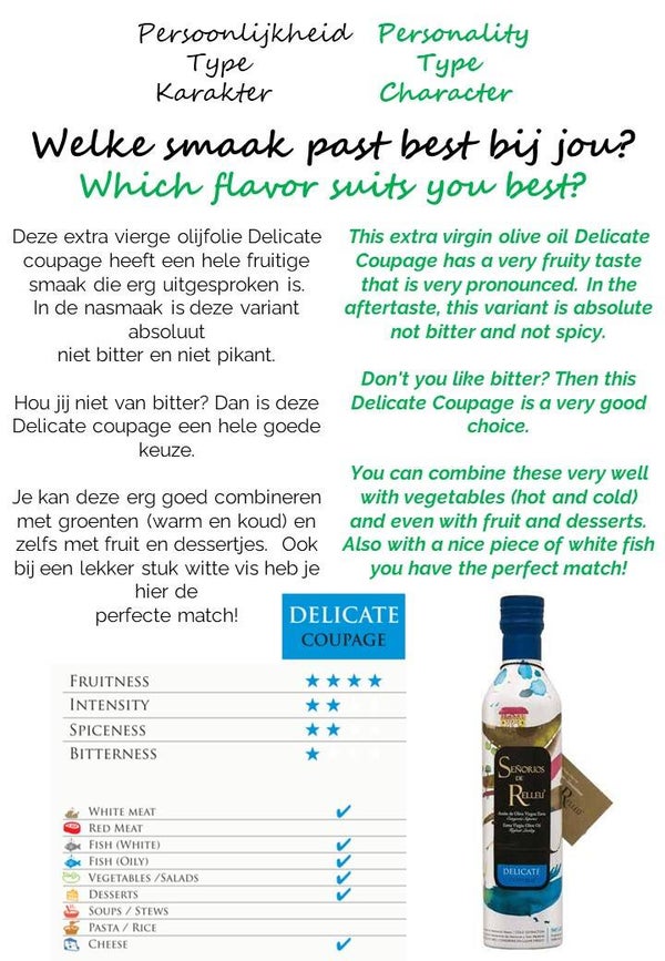 This extra virgin olive oil Delicate Coupage has a very fruity taste that is very pronounced. In the aftertaste, this variant is absolute not bitter and not spicy. Don't you like bitter? Then this Delicate Coupage is a very good choice. You can combine these very well with vegetables (hot and cold) and even with fruit and desserts. Also with a nice piece of white fish you have the perfect match!