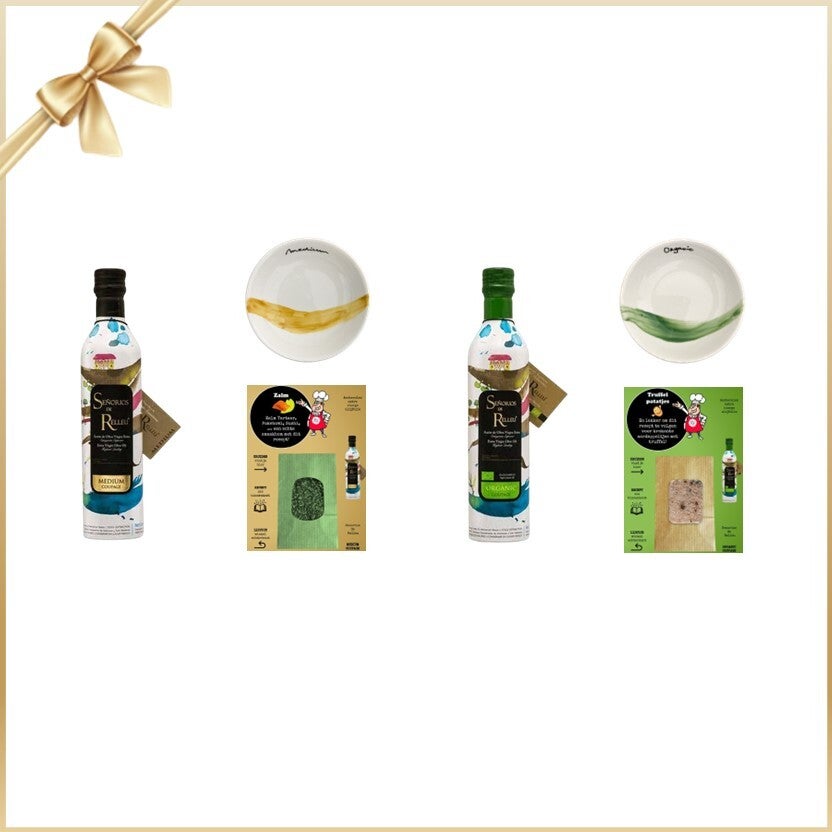 INHOUD: 1 x 500 ml evoo Medium coupage / 1 x 500 ml evoo Organic coupage / 2 x handgeschilderde olijfolie of tapa schaaltjes / 1 x receptkaart incl. kruidenmix zalm / 1 x receptkaart incl. kruidenmix truffelzout / 1 x foodpairing tabel