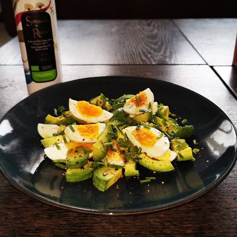 Ontbijt of Lunch met avocado, ei en bieslook met extra vierge olijfolie Organic Coupage